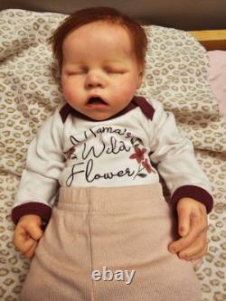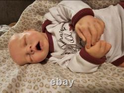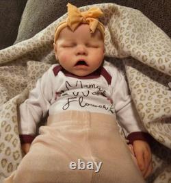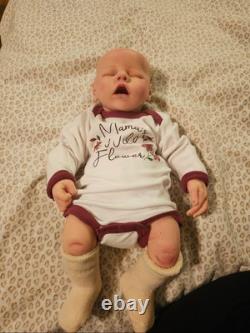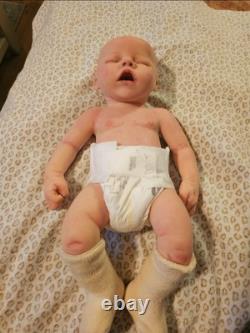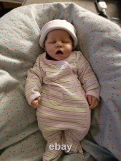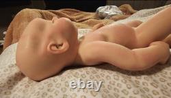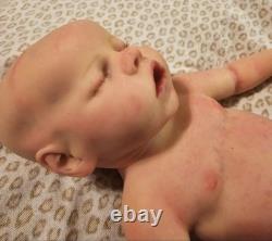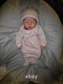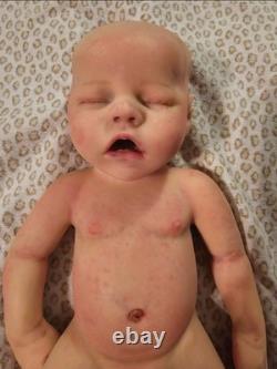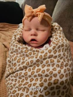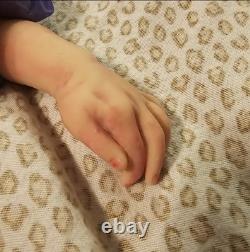 This baby is an intricately hand-painted, 14 in preemie girl with lightly hand-rooted hair. Hair can be removed if you prefer the bald look. She weighs 5 lbs and is adorable, soft, squishy, and so life-like! Beautiful hand-rooted lashes and sweet baby smell. She feels so real and is great to snuggle with.